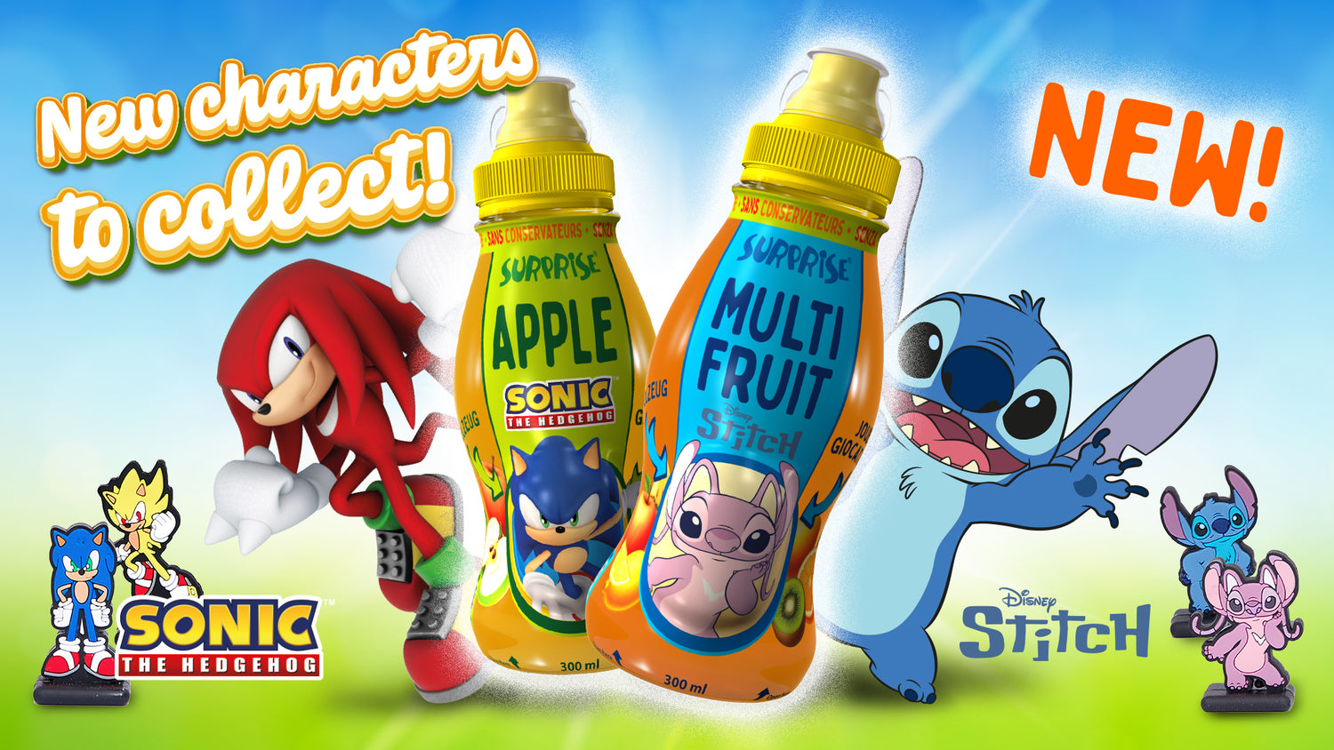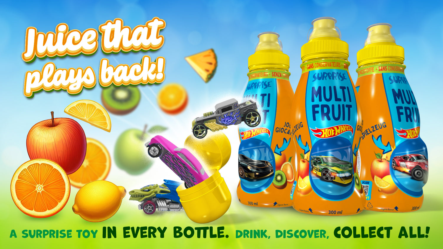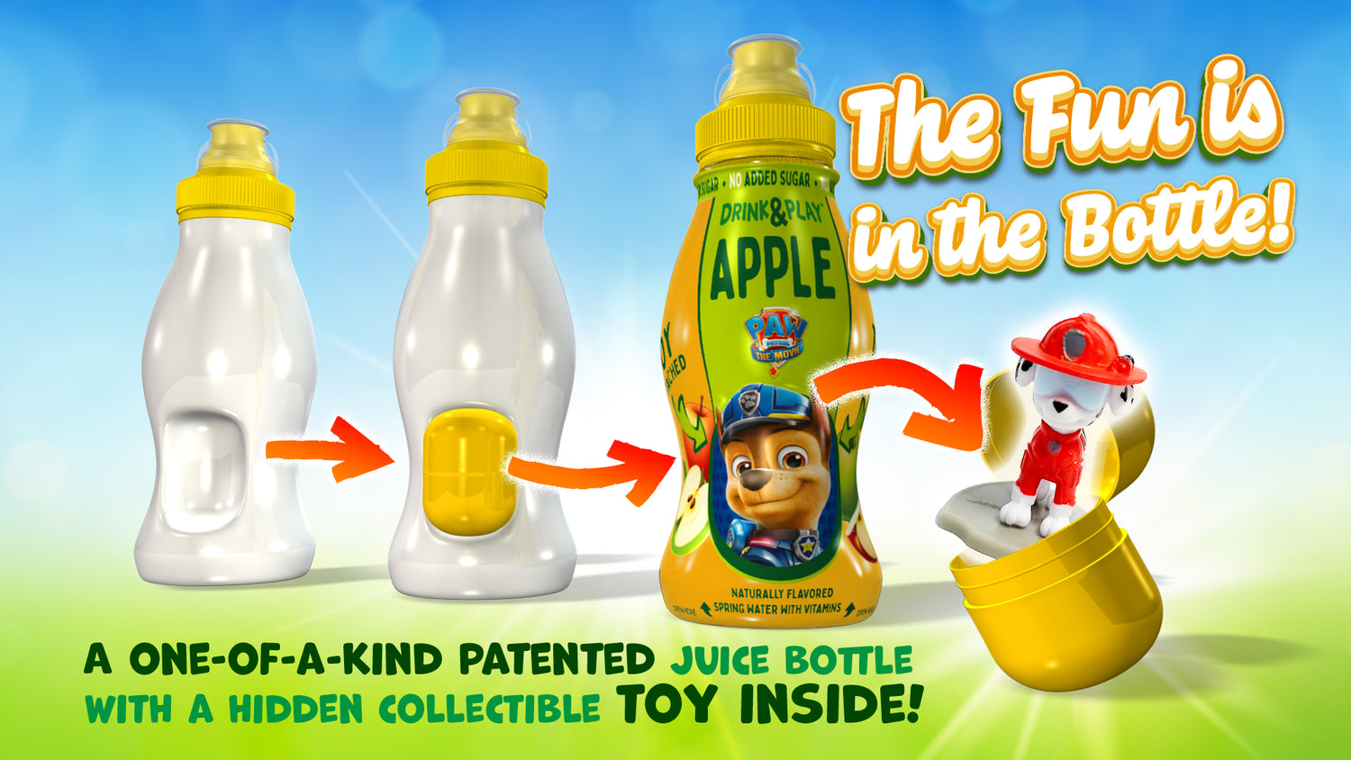 Napój owocowy lub nektar w specjalnie ukształtowanej butelce z wnęką mieszczącą licencjonowaną zabawkę lub gadżet premium w typowej żółtej kapsułce.